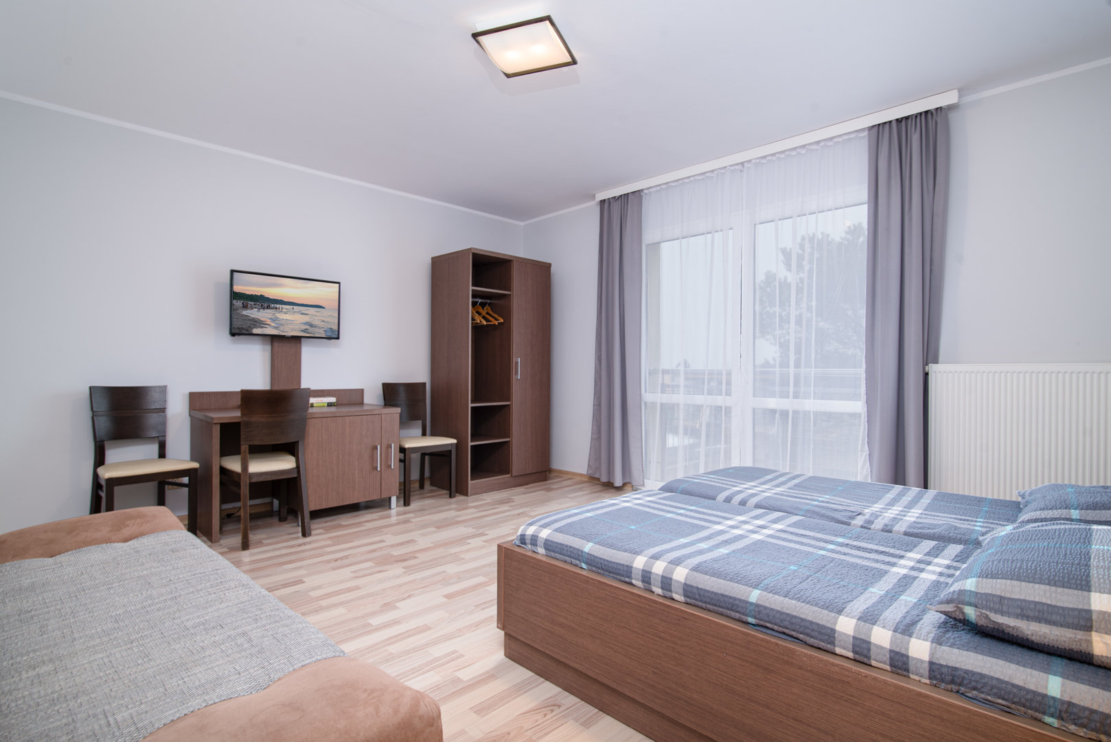 Apartament z dwoma pokojami o pow. 30 m²: pierwszy pokój z wyposażonym aneksem kuchennym i podwójnym łóżkiem 80x200 [po zsunięciu 160x200 cm] jedna sypialnia z dwoma łóżkami pojedynczymi [80X200 cm], które mogą być zestawione jako łóżko małżeńskie [wym.